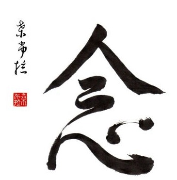 Mindfulness is 'nen' in Japanese and represented by Japanese kanji having two elements. The mountain is a top character implying the present moment. Below the peak is shin translating into the heart and/or mind.